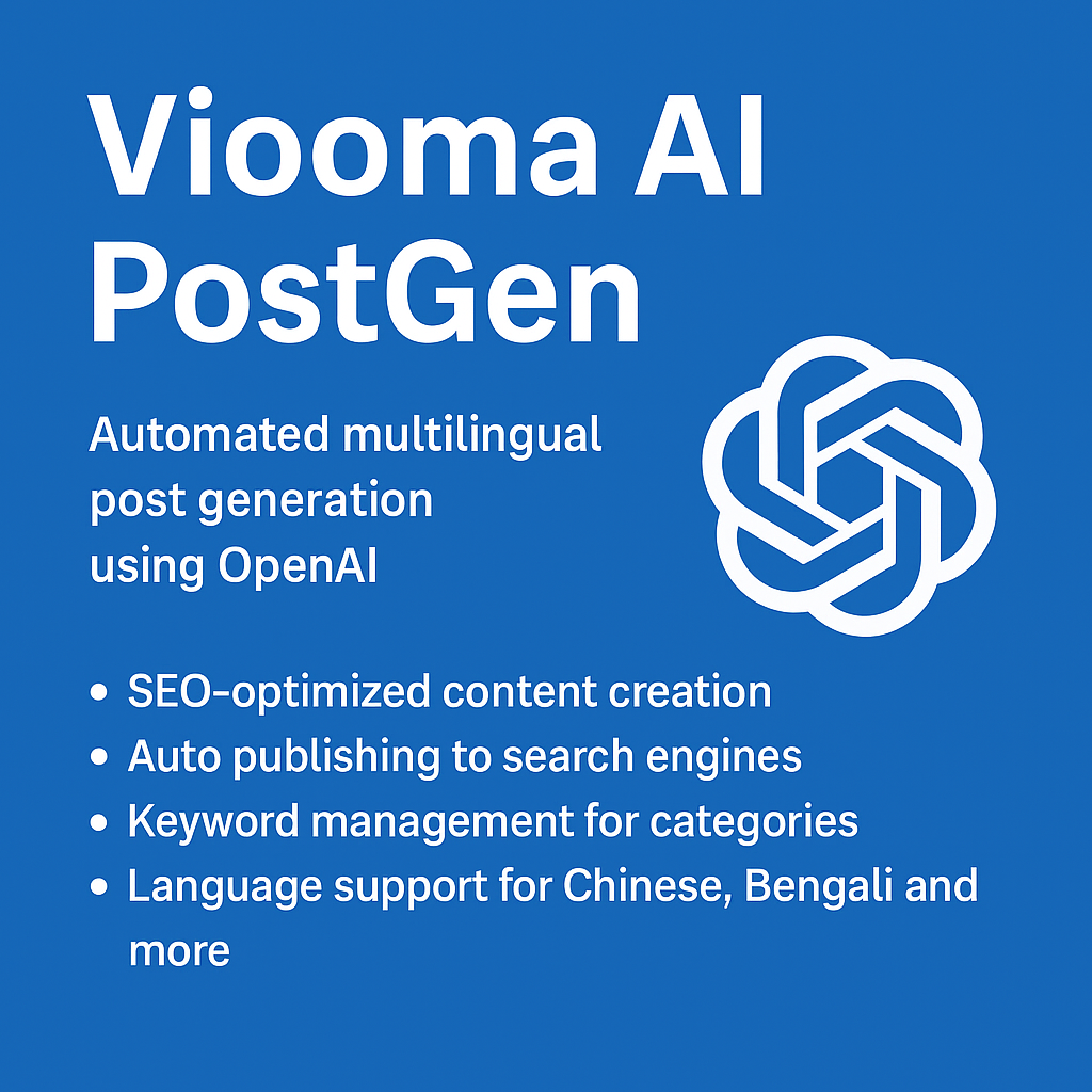 Viooma AI PostGen 是一款集成 OpenAI 内容生成、关键词管理、自动文章发布与搜索引擎主动提交的 WordPress 插件。它专为内容站点、资讯站群、AI营销运营者设计,帮助您快速、自动、高质量地生成原创文章,并同步推送至 Google 或百度等搜索引擎,提升收录效率与流量变现能力。